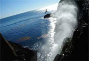 La Bufadora is a marine geyser, or Blowhole located on the Punta Banda Peninsula in Baja California, Mexico. The spout of marine water (occurring every minute or so to varying degrees of height) is created when ocean waves and air are drawn into an underwater cave located in the cliffside. The deep underwater canyon at La Bufadora has been gouged out over eons of time by trillions of tons of pounding surf. Waves coming in a narrow path in the rock shore, force the Ocean thru a hole. The water shoots high into the air. This phenomenon of nature has been a strong influence in the tourist development of Punta Banda peninsula. This is the reason for La Bufadora name, "The Blowhole". The invading ocean wave collides with the air that is drawn down in a pumping action caused by the force of receding waters after the previous spout. For an instant, trapped air and water choke the cave, then the compressed air and water explode through the only exit. This marine geyser is considered as the second highest of the world, after Hawaii. Newly renovated with botanical gardens and various observation decks, several with handicapped access. 22 miles south of Ensenada near the tip of Punta Banda peninsula. Small parking fee. During incoming tide, waves rush into an underground cavern and force out the water as high as 25-30 meters through a hole in the cavern. You'll find restaurants, shops & tourist facilities at La bufadora. The La Bufadora area is also known for great diving.